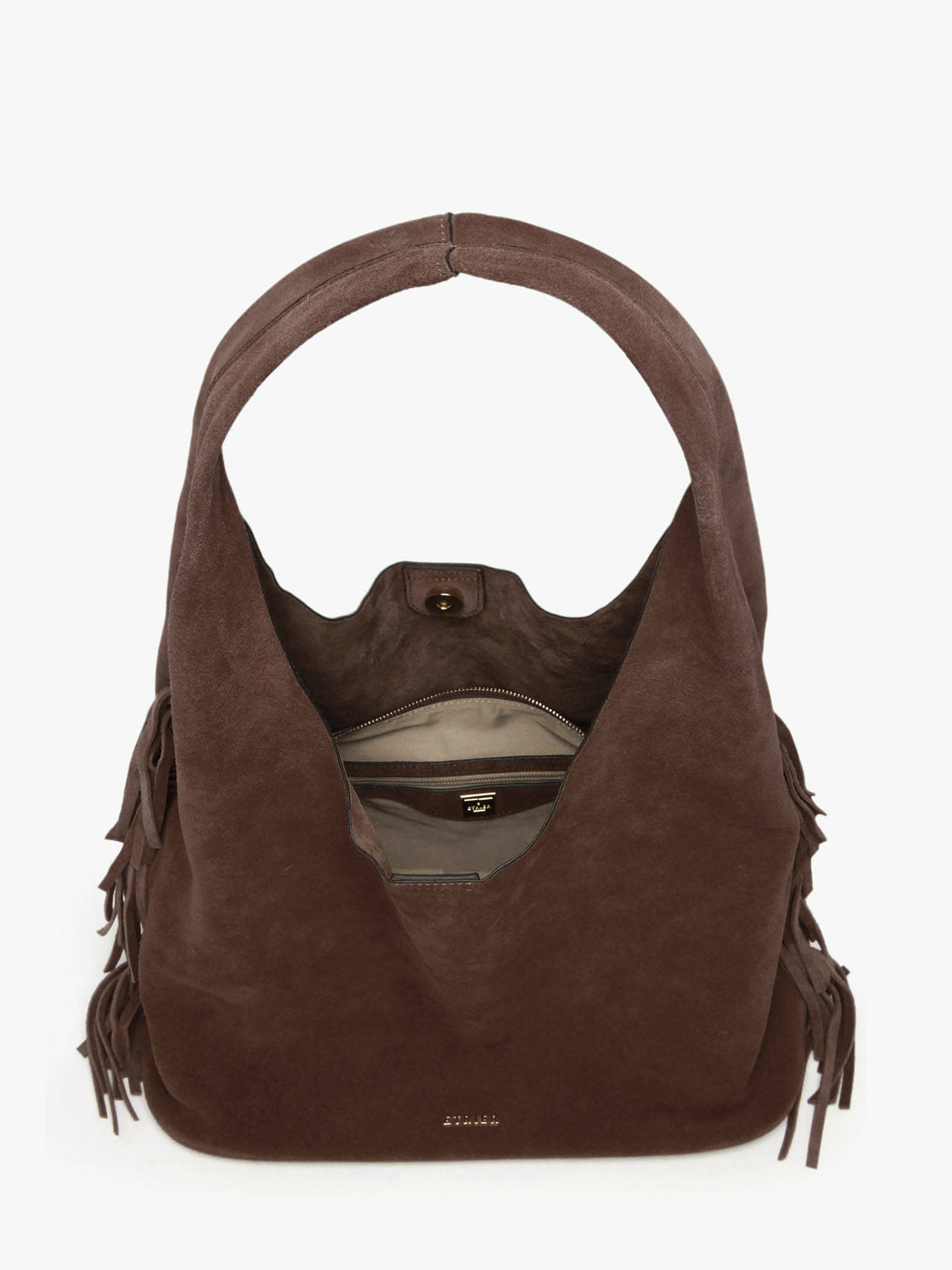 Le sac porté épaule ETRIER de la ligne COUNTRY est confectionné en cuir velours. Ce modèle hobo, proposé ici dans son format L, se distingue par sa silhouette souple, ses franges latérales emblématiques et son esprit bohème chic. Il se ferme à l’aide d’une pression aimantée. À l’intérieur, un pochon amovible permet de sécuriser vos effets personnels tout en structurant l’espace. Le dos du sac accueille une poche plaquée en cuir lisse. Dans son format généreux, ce sac incarne un style libre et élégant, idéal pour l’hiver, avec des textures authentiques et un mouvement naturel.